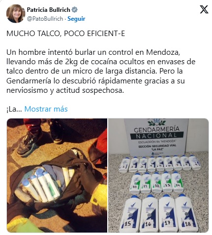 «Mucho talco, poco eficient-e», tuiteó la ministra de Seguridad Patricia Bullrich, el 6 de octubre, jugando con una marca del producto desodorante. Y detalló: «Un hombre intentó burlar un control en Mendoza, llevando más de 2 kg de cocaína ocultos en envases de talco dentro de un micro de larga distancia.